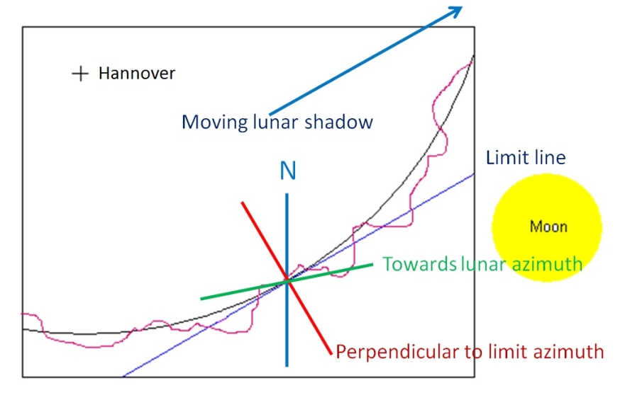 The picture shows the shape of the moon as it is invisibly projected on the earth’s surface during an occultation of a star. The lunar terrain features are considerably increased in scale. The shadow can move over the earth in different angles but always from west to east according to the motion of the moon. The path of the mean lunar limb on mean sea level (MSL) is the one that is always calculated and shown in the predictions. The planning of the location of observing stations needs to take into account the positive and negative extent of the projected lunar limb structures over the mean limb as well as the altitude on Earth.