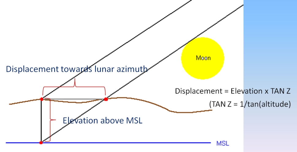 Due to the lunar parallax the line of view to the moon and thus the distance of the lunar surface to the star to be occulted changes with the altitude of the observer. Therefore the observing position must be adjusted accordingly by a displacement in the direction of the lunar azimuth (see picture below).