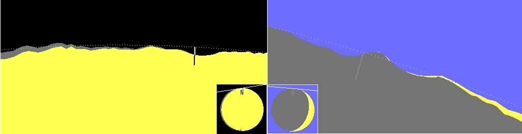 Each grazing occultation has its unique character. Depending on the phase of the moon, the magnitude of the star, its altitude above the horizon and the sky brightness due to the sun’s altitude circumstances always differ. It is needless to explain that a bright star event on the unlit limb part of a crescent moon even with a brighter sky background (left) is much easier to observe than a grazing occultation of a faint star on the bright lunar limb close to full moon (right). Even for events on the dark lunar limb at gibbous phases the glare of the bright moon causes seeing problems through irradiation for visual as well as video observations. Grazing occultations on the sunlit lunar limb are limited to stars of magnitude 3.5 or brighter. Each observer has to judge the observability of an occultation, also depending on his or her equipment