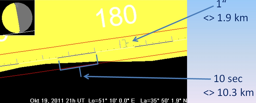 The picture below shows a part of the southern sunlit lunar limb in true scale covering about 1 degree of position angle. The dotted line marks the mean lunar limb which is overtopped by the true lunar terrain in this area. The right curly bracket includes an angle of 1 second of arc which equals 1.9 km on the moon at mean lunar distance from earth. The line dashed blue and white is the apparent stellar path, where each equally colored leg shows the lunar motion within 10 seconds of time (see bracket below). At mean lunar distance in 10 seconds about 10.3 km of lunar terrain move alongside the star.