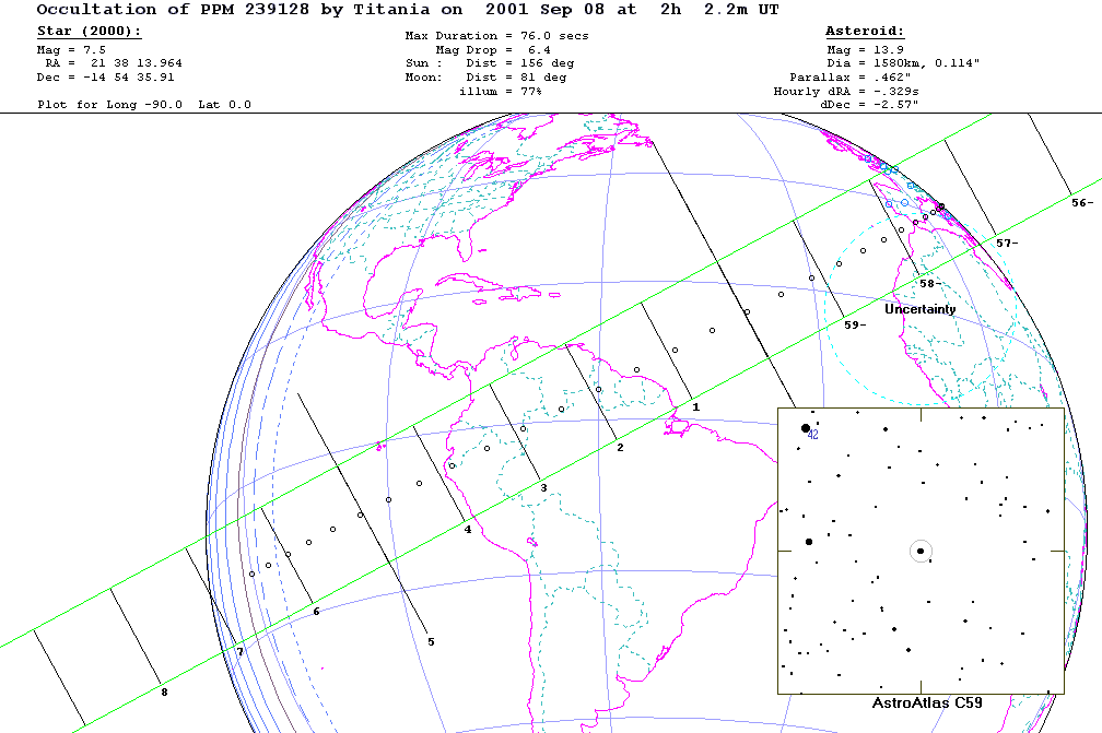 On the 8th of September 2001, around 2h UT, the large satellite of Uranus TITANIA will occult a 7m2 star HIP 106829. The event can possibly be seen from Colombia, Ecuador, Venzuela, the Azores and (?) Canarian Islands, Portugal, Spain and large parts of western Europe. An update of the last astrometry (as of July 12th) can be seen in the following view. It has been generated by Bruno Sicardy from measurements obtained by Bill Owen at the Table Mountain Observatory for Uranus and Titania on May 17th, June 20th and June 21st.
