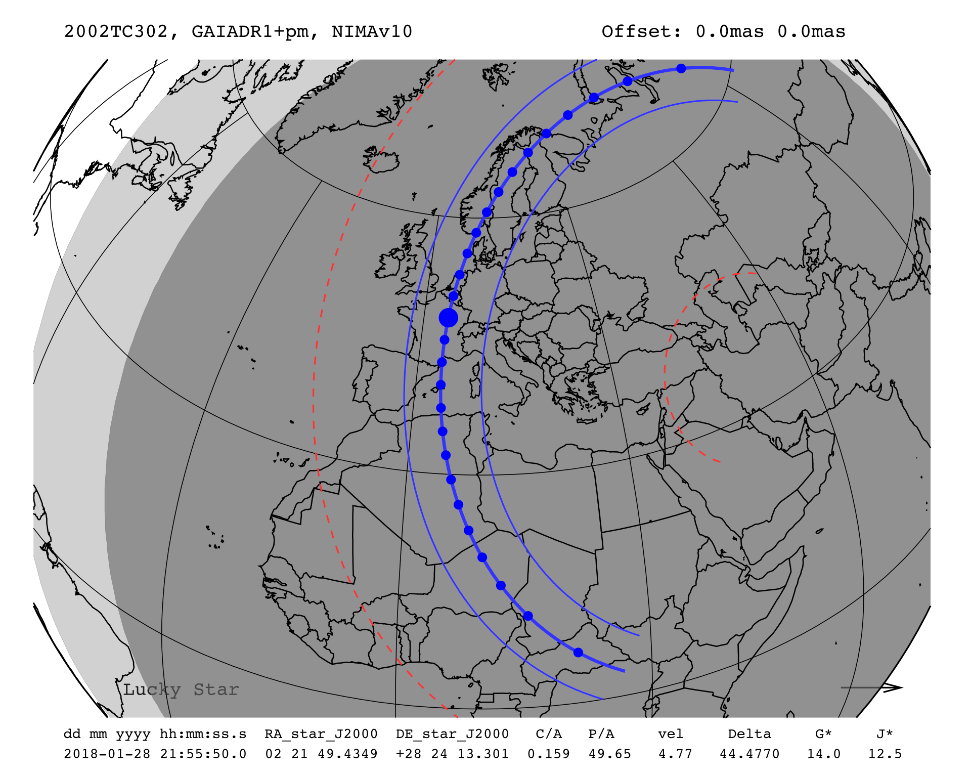 The TNO 2002TC302 occults the star UCAC4-593-005847 (15m8) for Europe on 2018 January 28 around 21h55min UTC. The TNO has an approx. diameter of around 580km. The prediction has been made by the LuckyStar team (J. Desmars and B. Sicardy and the RIO team). It is based on a GAIA DR1 catalogue position, the proper motion has been taken from the UCAC5 catalogue. The ephemeris of 2002TC302 is from NIMAv10.
