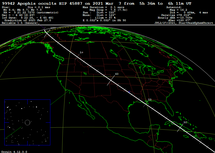Apophis has an average diameter of 370 m, but a flattened shape (approx. 450 x 18 m) as measured by radar ranging (Brozoviç et al. 2018). On March 6th, 2021 at 01:06 UT Apophis will be at its closest at ~43.8 lunar distances from Earth. The next close encounter will be that of April 13th, 2029.
