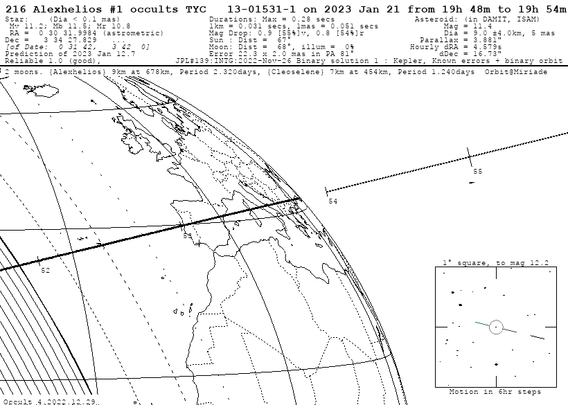 The occultation of Kleopatra itself (Spain, Sardinia, Italy, Greece) should be ok and would be very nice to have for the shape of Kleopatra. The occultation by Alexhelios would be challenging. I do not know how many observers from North Africa are also in contact with the European section, but the occultation by the inner moon Cleoselene will be visible from Marocco-Algeria-Tunisia.